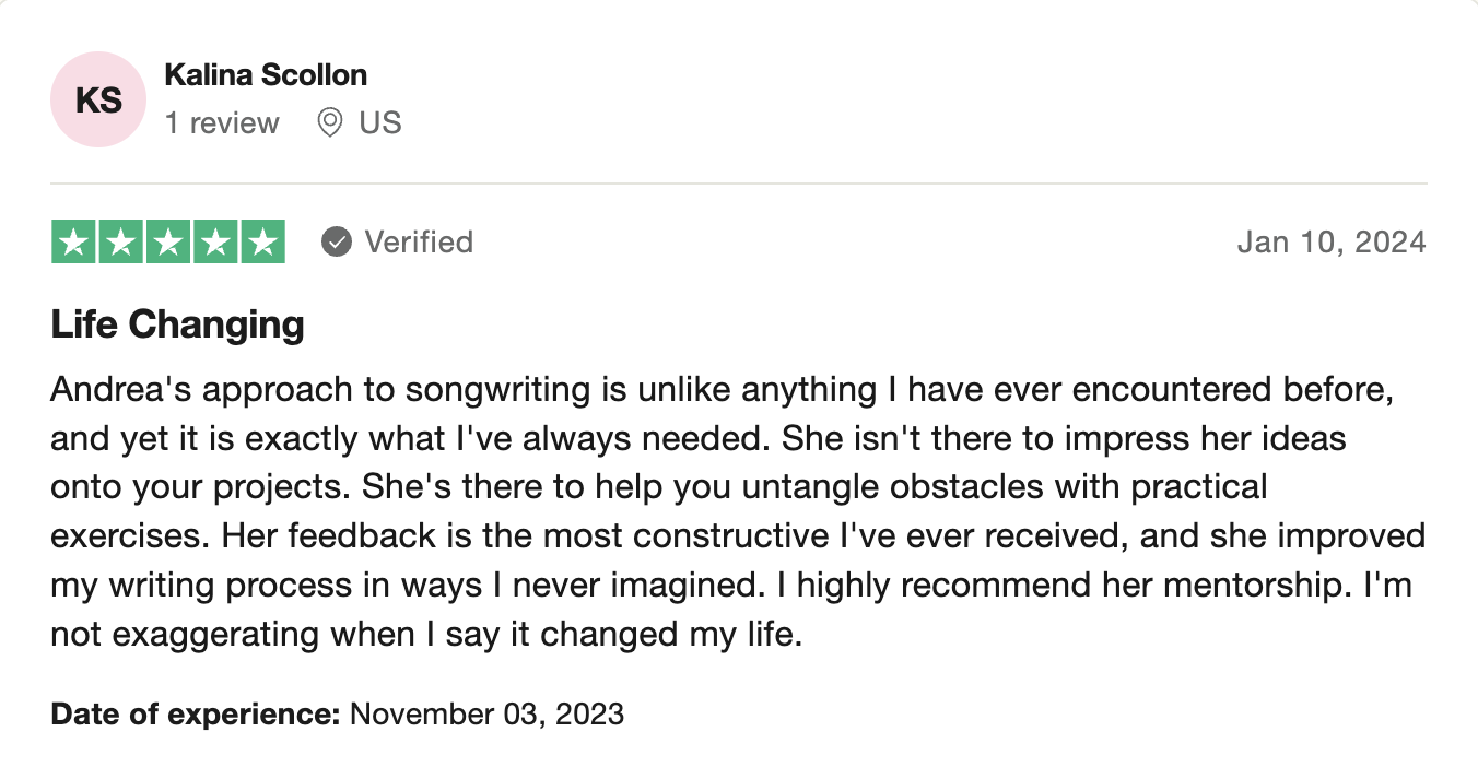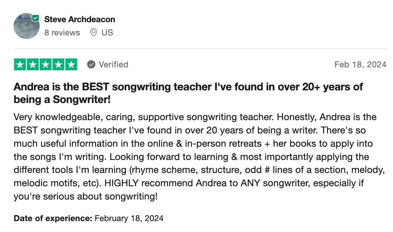 Andrea has figured out a way to take the tools of songwriting and codify them in such as way as to make songwriting learnable if you are willing to do the work and follow the steps. She is insightful in her individual comments no what matter level you are as a writer. I highly recommend this experience if you are songwriter and want to further your skillset. This workshop was very useful to me!
