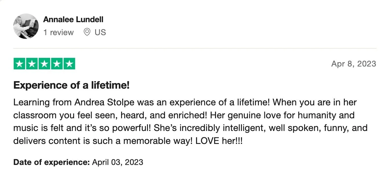 Andrea is incredibly knowledgeable about her craft and I was impressed at how thorough and concrete her process and tips were to help construct songs. She was extremely empathetic and attentive with everyone who asked a question and I could tell she had a genuine interest in helping everyone there. If you’re looking to level up your songwriting I’d recommend checking this out.