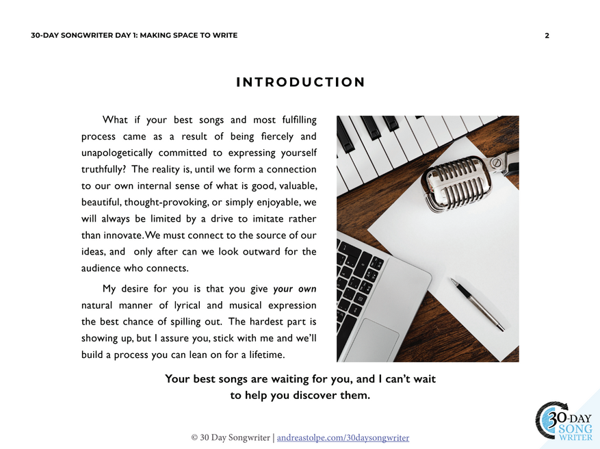 For this reason I've made sure that The 30-Day Songwriter contains everything you will need and will provide accountability to help keep you on track throughout the course.